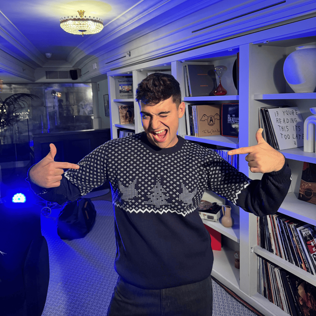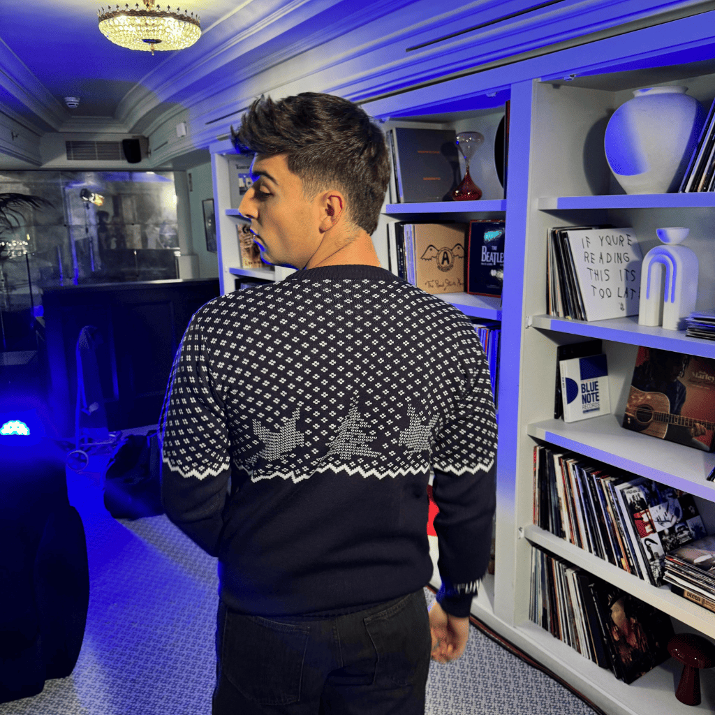 Jersey navideño azul edición limitada con estampado "Recardelino", pensado para pasar las tardes de invierno con amigos y disfrutar las fiestas a tu manera. (Por si te gusta el fit, Juanjo lleva una talla M).